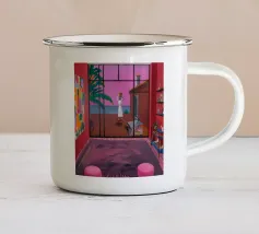 L'ambiente interno è caratterizzato da pareti rosa caldo, un mobile in legno che espone oggetti decorativi, una parete di galleria eclettica e una vista su una stanza adiacente.