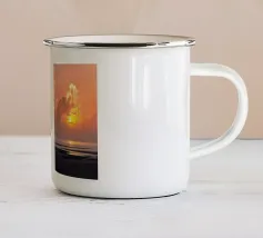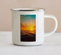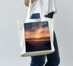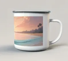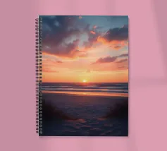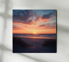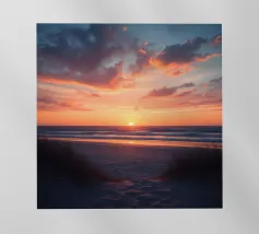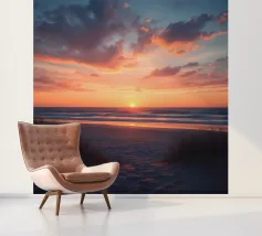 Uno splendido tramonto proietta calde sfumature nel cielo mentre il sole scende sotto l'orizzonte. Le onde delicati lambiscono la riva, creando un'atmosfera serena la sera.