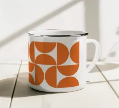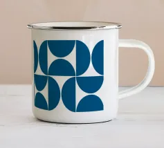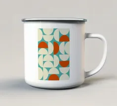Un motivo geometrico ripetitivo presenta file alternate di semicerchi e cerchi nei colori blu e ruggine su uno sfondo chiaro. Il disegno crea un senso di ritmo e movimento grazie alla sua disposizione simmetrica.