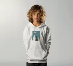 Le forme geometriche formano un paesaggio montano minimalista, con un cerchio in alto che ricorda il sole. Sotto è raffigurato un riflesso invertito delle cime, che crea un disegno simmetrico.