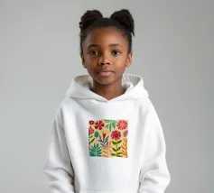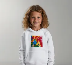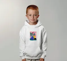Una moderna natura morta astratta con una pianta stilizzata in un vaso blu, un croissant e forme organiche sotto un sole giallo, il tutto in una composizione equilibrata e calda.