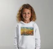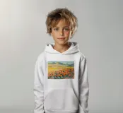 Un campo di papaveri arancioni crea un brillante patchwork di colori su dolci colline verdi e dorate, rese in modo stilizzato e moderno che enfatizza la gioia del paesaggio.