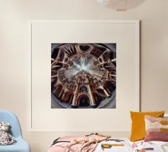 Una splendida vista fisheye di un atrio futuristico caratterizzato da un'architettura geometrica, balconi e un soffitto a cupola di vetro. L'intricato gioco di forme e luci crea un design urbano coinvolgente e di grande impatto visivo.
