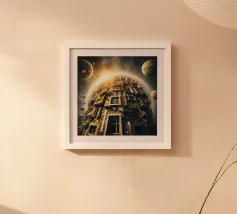 Una surreale visione fisheye di strutture urbane torreggianti con dettagli intricati e modelli simmetrici, che convergono verso un cielo radioso. Il design architettonico stratificato evidenzia l'innovazione moderna e la creatività artistica.