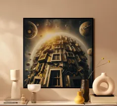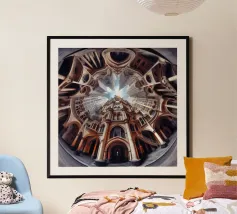 Un'accattivante vista con lente fisheye di un edificio in stile neoclassico circondato da strutture ornamentali in un cortile urbano. La prospettiva distorta enfatizza i dettagli intricati, la simmetria e la grandezza architettonica della scena.
