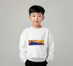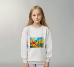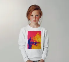 Quadro astratto dinamico che presenta un'architettura surreale, vivaci toni arancioni e blu, alberi astratti e sfere fluttuanti in un paesaggio fantastico. I tratti strutturati e i contrasti decisi creano un'atmosfera onirica ed energica.