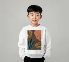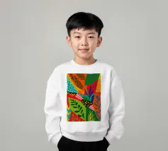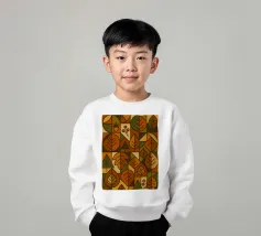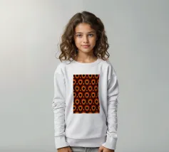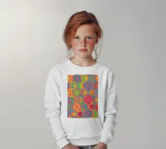 Audaci motivi geometrici con spirali, zigzag, punti e triangoli creano un vivace disegno simmetrico. I colori vivaci come l'arancione, il verde e il giallo contrastano formando un'immagine di grande impatto.
