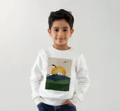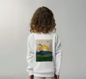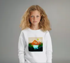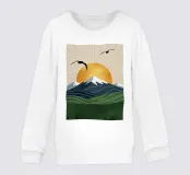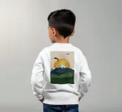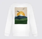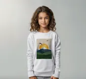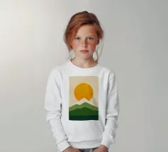Un'illustrazione splendidamente stratificata e minimalista che presenta una maestosa catena montuosa innevata e i pendii inferiori ondulati, racchiusi in una forma astratta a goccia. Il disegno utilizza colori naturali e tenui e sottolinea i contorni sereni del paesaggio selvaggio.