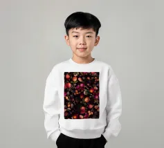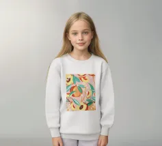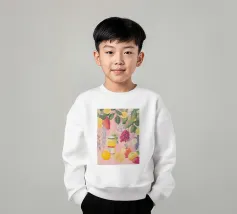 Un collage colorato di frutta fresca e fiori di ciliegio in tenui colori pastello che dà vita all'estate su uno sfondo rosa. Ideale per gli amanti del mercato della frutta e della natura!