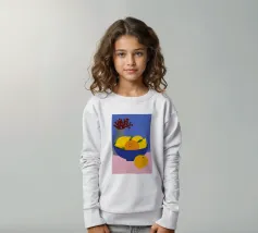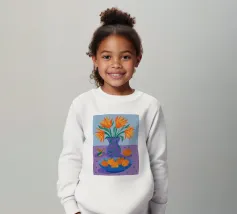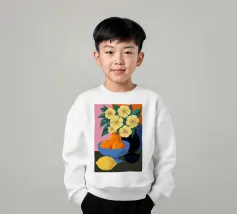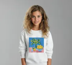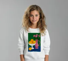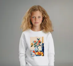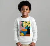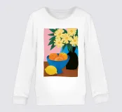 Un'elegante e semplice natura morta con un bouquet di fiori gialli in un vaso scuro accanto a una ciotola blu profondo piena di arance fresche. La composizione è serena e senza tempo, con un bel contrasto di colori.