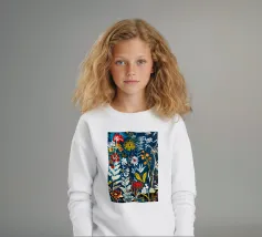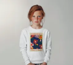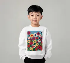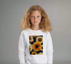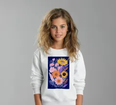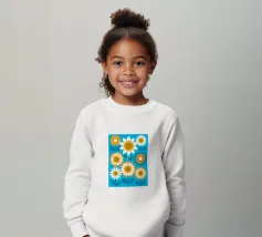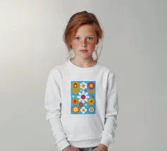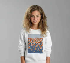 Un campo infinito di fiori grafici nei colori vivaci dell'arancio, del blu e del crema: moderno, giocoso e pieno di energia. La ripetizione ritmica crea una sensazione di infinito e leggerezza. Questo motivo porta il calore dell'estate e una moderna dichiarazione di design in ogni stanza.