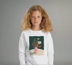 Un'affascinante natura morta di un semplice bouquet di fiori bianchi e arancioni in un vaso, seduto su un tavolo con una tovaglia a scacchi rossi e bianchi. La scena ha un'atmosfera calda, rustica e leggermente nostalgica.