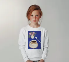 Vista dall'alto di una semplice colazione su una tovaglia a scacchi rossi e bianchi, con una tazza di caffè e un ramo d'albero. La composizione minimalista ha un'atmosfera serena, grafica e classica da caffè.