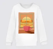 Un'illustrazione semplice e confortante di una tazza rosa di caffè o tè fumante, appoggiata a una finestra con vista sul sole che sorge. La scena cattura perfettamente il calore e la speranza di un nuovo mattino.