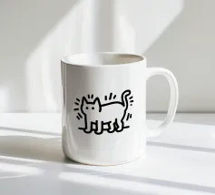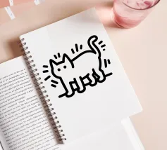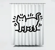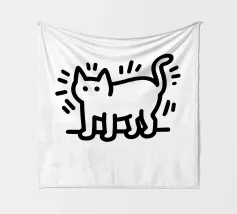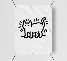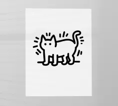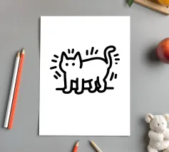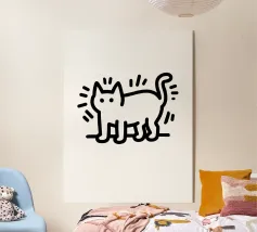 Il disegno semplice e deciso di un gatto è evidenziato da linee radianti che ne sottolineano la natura giocosa. Il gatto sta in piedi con la coda sollevata, esprimendo curiosità o eccitazione.