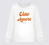 Un motivo ridotto ma potente che cattura il calore e l'affetto italiano in forma tipografica: La scritta "Ciao Amore" appare in corsivo curvo e grassetto in rosso vivo - senza ombre o effetti, ma chiara, diretta ed emotiva. Sotto, più piccola ed elegante, la firma "studio scusi", che sembra un timbro personalizzato.