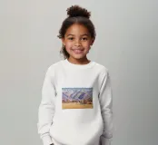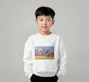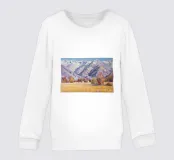 Maestose montagne innevate si ergono su una valle tranquilla e invernale; la luce nitida e la fresca tavolozza di bianchi, blu e gialli pallidi catturano la bellezza silenziosa e serena del paesaggio alpino.