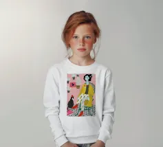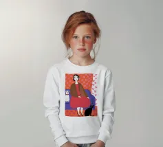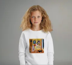 Una donna si trova in una cucina dai colori vivaci con un dalmata al suo fianco, una finestra che mostra una scena all'aperto e vari dettagli della cucina, creando un'illustrazione domestica eccentrica e affascinante.