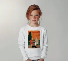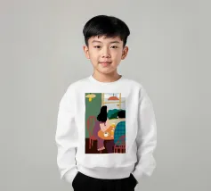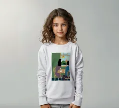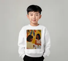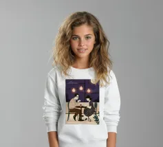 Un'illustrazione intima che cattura un momento di tranquillità tra due persone sedute a un tavolino di un bar. L'illuminazione calda e tenue e la loro interazione concentrata creano un racconto di conversazione e connessione, rappresentativo della vita sociale moderna.