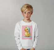 Un simpatico anatroccolo con un foulard blu si trova su una pozzanghera azzurra. L'anatroccolo ha grandi occhi espressivi che gli conferiscono uno sguardo affascinante e accattivante.
