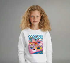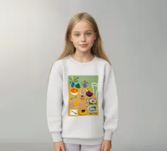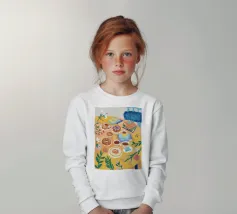 Illustrazione luminosa e allegra di un tavolo per la colazione illuminato dal sole, con caffè, succo d'arancia e pasticcini su un vivace sfondo giallo.