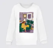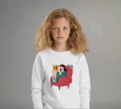 Una donna si accoccola su un divano verde, immersa in un libro e con una tazza di tè vicino. La stanza è decorata con piante e opere d'arte, creando una scena perfetta di confortevole solitudine e fuga intellettuale.