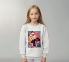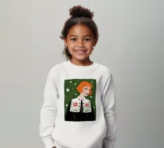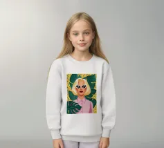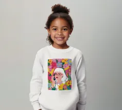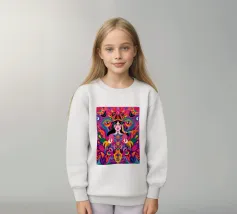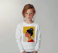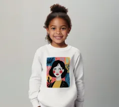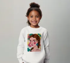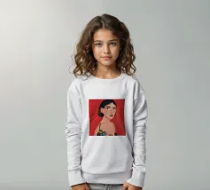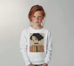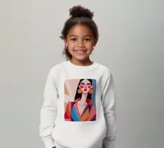 Questo dipinto raffigura una persona con i capelli neri che indossa un abito colorato con forme geometriche. Lo sfondo è rosso e la persona è adornata con grandi orecchini circolari.