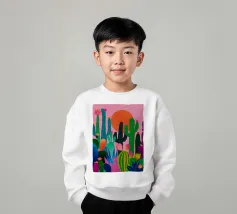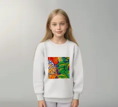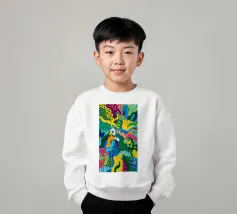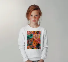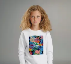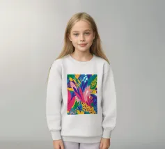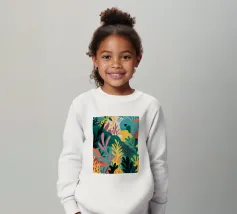 Una composizione astratta alta e stretta, piena di forme e motivi di foglie colorate sovrapposte, che suggerisce una fetta vibrante di una fitta giungla verticale.
