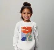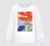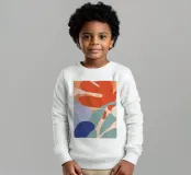 Una composizione astratta ispirata a Maraoui, con forme semplici e ritagliate in colori primari come il rosso, il blu e l'arancione su un morbido sfondo color lavanda. L'opera d'arte è al tempo stesso giocosa e sofisticata.