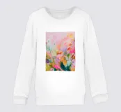Il motivo mostra una composizione floreale dinamica e astratta, dai colori pastello decisi ma delicati. Pennellate di rosa, arancione e verde formano una moderna interpretazione di un prato fiorito estivo. La pittura conferisce all'opera profondità, leggerezza e un'aura naturale e vivace.