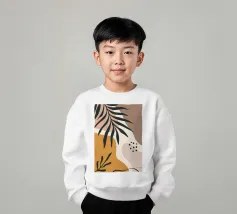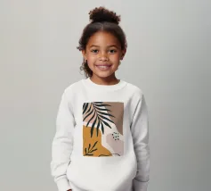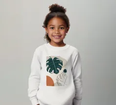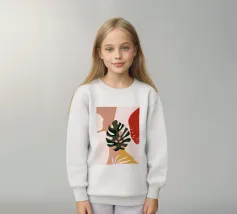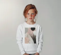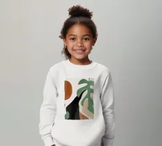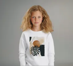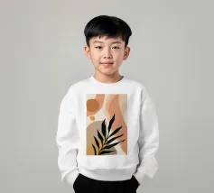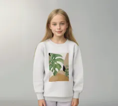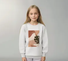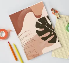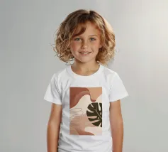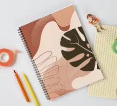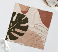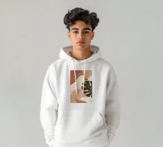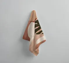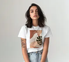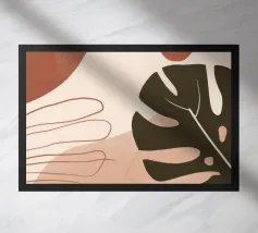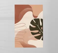 L'immagine presenta un'illustrazione astratta con una grande foglia di monstera nera e il contorno di una mano. Lo sfondo è costituito da forme morbide e fluide nei toni del beige e del marrone, che creano un'atmosfera armoniosa e organica.