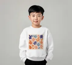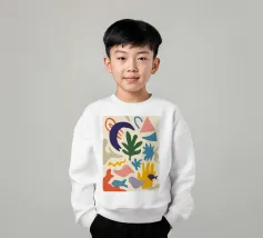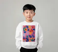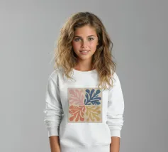 Un motivo di foglie stilizzate nei toni del verde, del rosa e della terracotta, ispirato ai ritagli di Henri Maraoui. La disposizione suggerisce una danza aggraziata di forme botaniche.