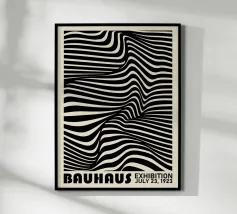 Questo espressivo design Bauhaus combina strisce di colore verticali e triangoli grafici per creare un quadro d'insieme ritmico ed energico. Linee chiare, colori vivaci e un gioco geometrico di movimento e struttura: un'opera d'arte moderna che illuminerà qualsiasi ambiente.