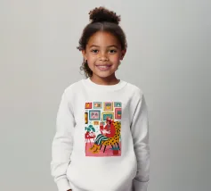 Una moderna natura morta astratta con una pianta stilizzata in un vaso blu, un croissant e forme organiche sotto un sole giallo, il tutto in una composizione equilibrata e calda.
