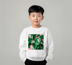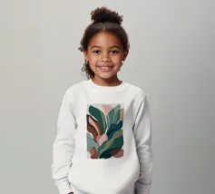 Forme botaniche astratte, tra cui foglie e steli nei toni del rosa, del viola, del blu e del beige, sono disposte su uno sfondo scuro. La composizione è elegante e moderna, incentrata su forme organiche e giochi di colore.