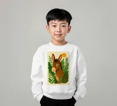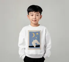 Quest'opera d'arte presenta un cavallo nero stilizzato in forma grafica e audace su uno sfondo neutro. Circondato da semplici foglie verdi astratte e da forme celestiali simili a stelle, il pezzo ha una qualità mitica e primordiale. La composizione minimalista enfatizza la potente silhouette del cavallo.