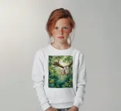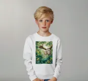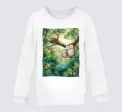 Un'affascinante scena di una mamma gufo che coccola il suo piccolo in una vivace giungla tropicale. Questo dolce disegno faunistico dona calore e un delicato tocco di natura a qualsiasi ambiente.