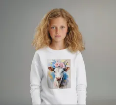 Simpatiche mucche scozzesi stravaganti in un prato selvaggio con copricapi floreali.