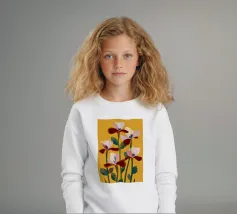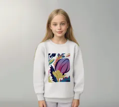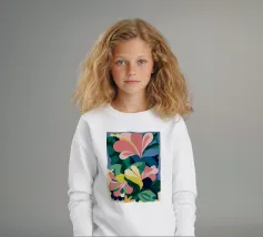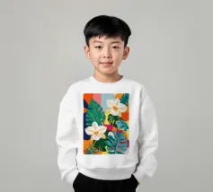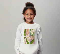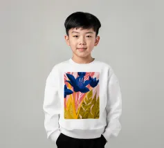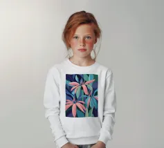 Un'illustrazione splendidamente dettagliata cattura l'eleganza di un'orchidea in fiore, con vibranti petali rosa, bianchi e gialli contrapposti a foglie blu intenso.