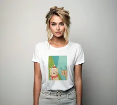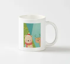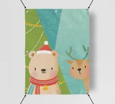 Allegra illustrazione con un orso e un cervo che indossano abiti natalizi accanto a un albero di Natale, irradiando allegria e felicità nel giorno di Natale.