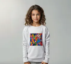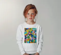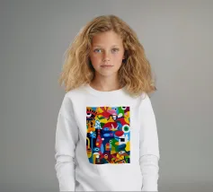 Un paesaggio surreale pieno di figure astratte, animali e forme geometriche. L'uso dinamico di colori vivaci e disegni intricati evoca immaginazione e curiosità.
