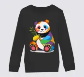 Illustrazione colorata di un simpatico panda con un ramo di bambù. Il motivo giocoso combina cordialità, calma e aree di colore moderne - ideale per i fan dei panda e per i disegni creativi di animali.