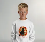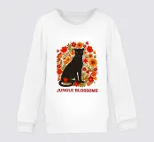 Sagoma di pantera nera circondata da fiori arancioni e rossi. Tavolozza calda, motivo floreale caratteristico; ideale per progetti audaci, tessuti grafici e accessori.