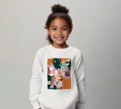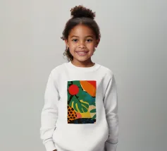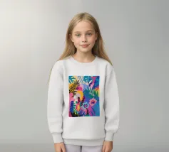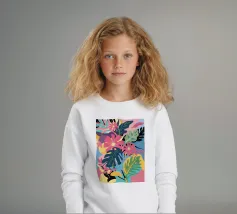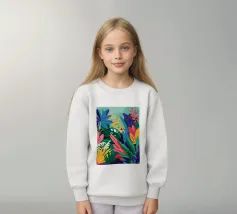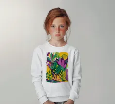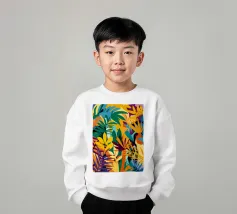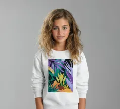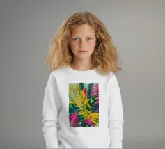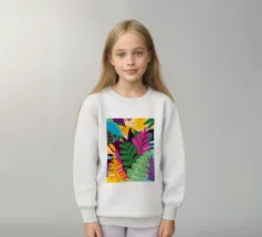 Una lussureggiante scena di giungla incornicia un grappolo d'uva viola, creando una natura morta unica e inaspettata che fonde il fogliame tropicale con la frutta del frutteto in una composizione vibrante.