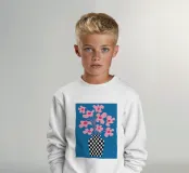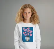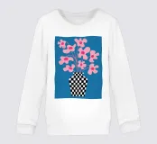 Un'illustrazione audace e grafica di un bouquet di semplici fiori rosa in un sorprendente vaso a scacchi bianchi e neri. L'alto contrasto e le forme semplici creano un pezzo moderno e giocoso con un forte impatto visivo.