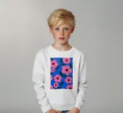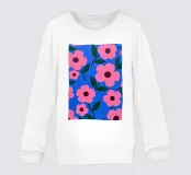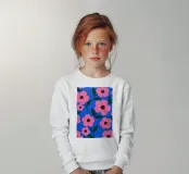 Un vivace motivo senza soluzione di continuità di fiori rosa stilizzati su uno sfondo blu scuro. La composizione è un pezzo audace, moderno e bellissimo di design grafico floreale.