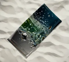 Un bicchiere riempito di liquidi colorati mostra vibranti tonalità verdi e blu. Le bolle si formano quando i liquidi si mescolano, creando un aspetto vivace e rinfrescante sotto una luce soffusa.