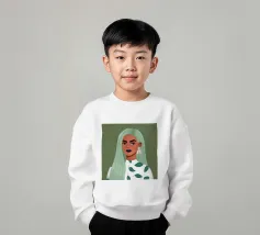Il dipinto raffigura una persona con capelli corti e scuri acconciati a onde, che indossa un abito con motivi retrò e cerchi e diamanti nei toni del rosa, del marrone e del beige. Lo sfondo è di un semplice colore beige chiaro.