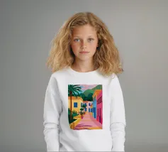 Una ripida scalinata colorata funge da strada in una città mediterranea, fiancheggiata da edifici di colore giallo, arancione e rosa, ornati da piante verdi in vaso.
