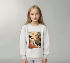 Una scena pittoresca di Santorini è caratterizzata da iconici edifici bianchi con cupole blu e una porta blu vibrante, che si affaccia sul mare scintillante sotto un cielo limpido con uccelli, incarnando il fascino idilliaco dell'isola greca.